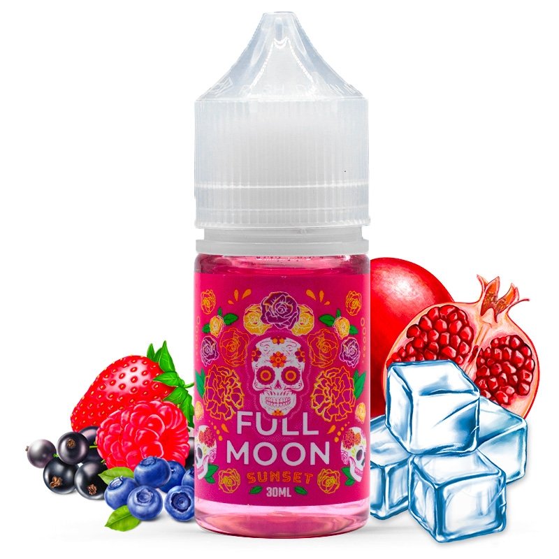 Full Moon met tout en oeuvre pour que l’été perdure ! Le maître des arômes concentrés est en passe d’atteindre son objectif. Le concentré Sunset est une mixture hypnotisante où les fruits rouges jouent le premier rôle. Juteux, ces derniers sont accompagnés par un intense jus de grenade et une fraîcheur enivrante. Full Moon transforme l’hiver en un mauvais et lointain souvenir.